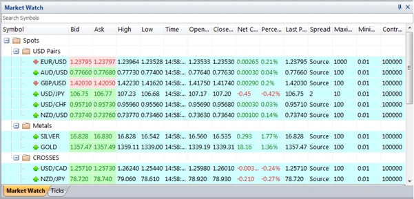 • Market Watch and Tick Charts: The Market Watch window shows real-time market activity/quotes, while the Tick Chart shows precise visual price movements.